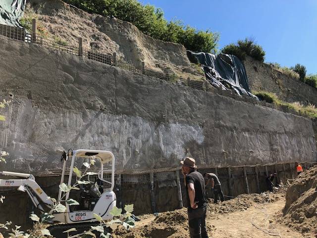 Ces ouvrages de soutènement, en restanque, d’une hauteur de 7,50 m pour le mur aval et d’environ 6 m pour le mur amont sont constitués de béton projeté, maintenu par 2 à 3 lits de clous et des micro-pieux.